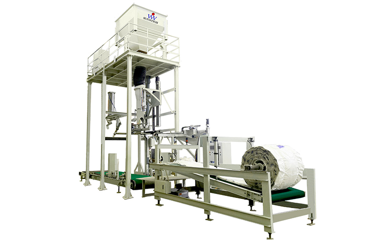 首先,工人將成卷的工業(yè)鹽噸袋用叉車插到噸袋包裝機(jī)空袋輸送機(jī)上,空袋輸送機(jī)將單個包裝袋輸送前移,當(dāng)空袋袋口到達(dá)全自動噸袋包裝機(jī)開袋處,上下吸盤將包裝袋袋口打開,上袋機(jī)械手夾住工業(yè)鹽包裝袋袋口,然后將包裝袋自動套在包裝機(jī)下料口上,檢測開關(guān)檢測到套袋成功后,夾袋夾自動夾袋,吹袋機(jī)構(gòu)將包裝袋吹起,方便物料均勻的沖入包裝袋,吹氣完畢,全自動噸袋包裝機(jī)自動將稱量好的物料一次性放到包裝袋內(nèi),同時除塵系統(tǒng)工作除塵,裝袋完畢,熱合裝置封袋,輸送機(jī)將包裝好的成品工業(yè)鹽噸袋自動輸出,完成工業(yè)鹽的全自動噸袋包裝。