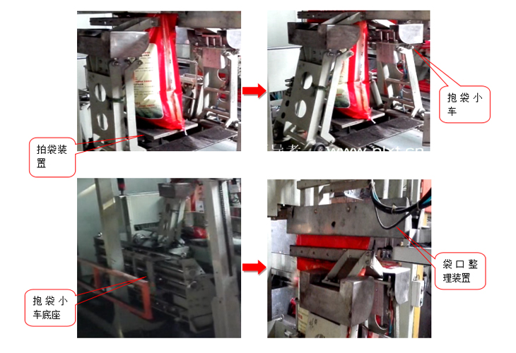 定量包裝機下料灌裝的過程中,底部的拍袋裝置啟動,確保袋內(nèi)物料充填緊密。灌裝結(jié)束后拍打停止,下料口夾袋裝置打開,充填物料后的包裝袋在下料口放下的同時,由送包小車經(jīng)專門加工的用于粉體、顆粒物料料袋的抱包、夾包裝置將料袋中部抱住,袋口夾住,送至活動導入裝置,活動導入與熱合縫包一體機系統(tǒng)相連.經(jīng)其進入封口傳動鏈中,保證袋口成一字形。在導入器附近增加吸塵口,通過與除塵系統(tǒng)連接可吸走夾住袋口時飛出的粉塵.